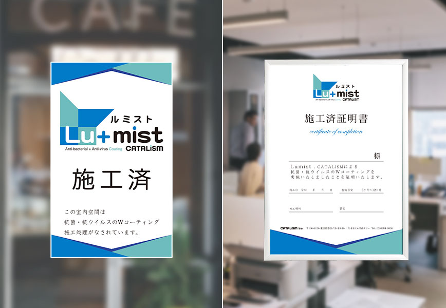 施設の抗ウイルス・抗菌の施工実施を証明する証書およびシールを発行しています。